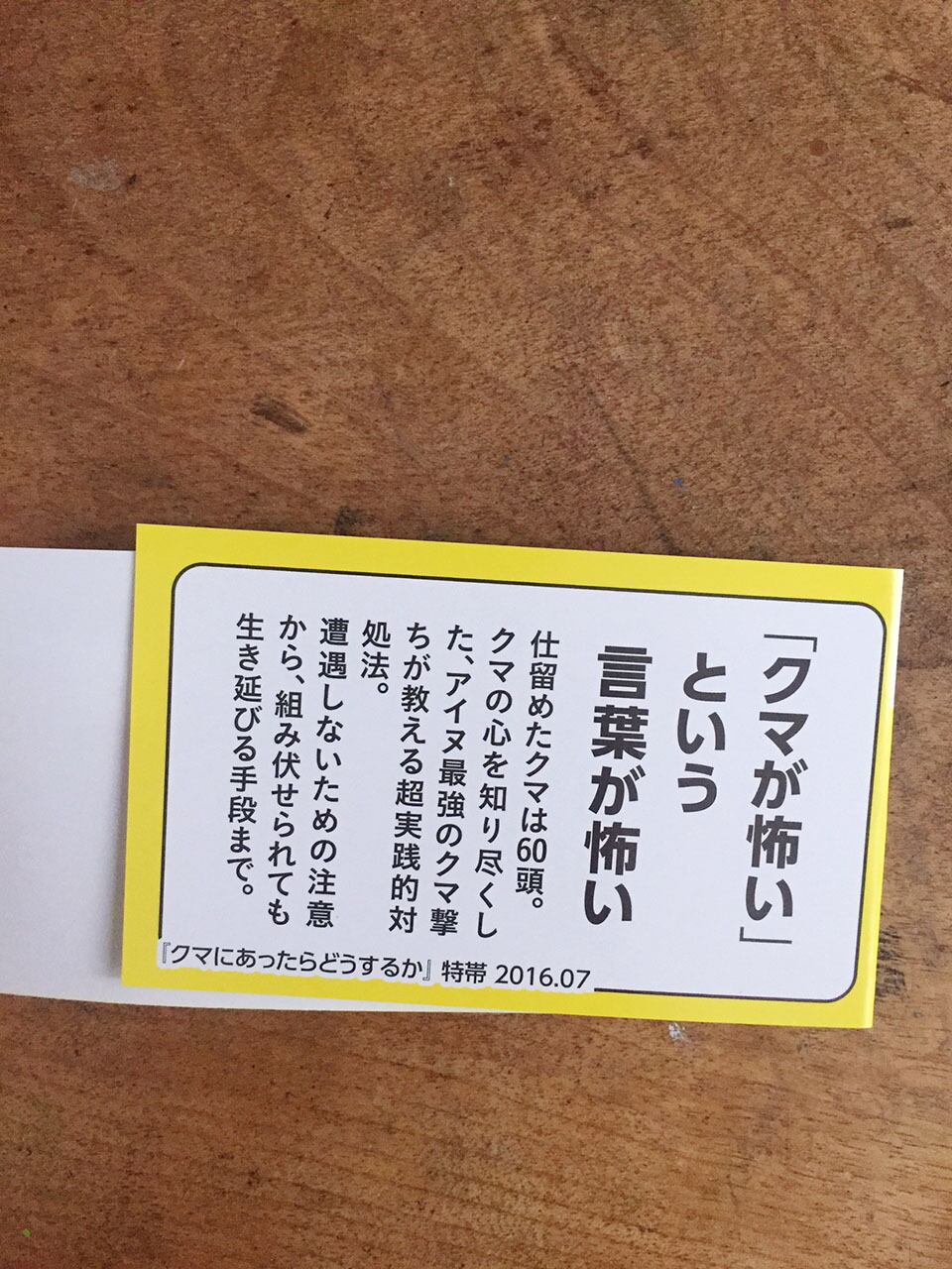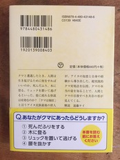【内容】クマと遭遇したとき、人間は生き延びるために何をすればいいのか。死んだふり、木に登る、リュックを置いて逃げるといった、巷に流れる俗説は有効なのか?「クマは師匠」と言うアイヌ民族最後の狩人が、アイヌの知恵と自身の経験から導き出した、超実践的クマ対処法を伝授。クマの本当の姿を知ることで、人間とクマの目指すべき共存の形が見えてくる。(筑摩書房HPより引用)